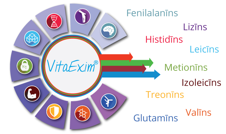 Cilvēka organisma šūnas sastāv no aminoskābēm. Ir zināmas 22 aminoskābes, kuras veido dažādu orgānu, nagu, matu, ādas, muskuļu un asins šūnas. Tiek iedalītas aizvietojamās un neaizvietojamās aminoskābes. Aizvietojamās sintezē cilvēka organisms, bet neaizvietojamās ir jāuzņem ar uzturu. VitaExim satur 9 svarīgākās neaizvietojamās aminoskābes.